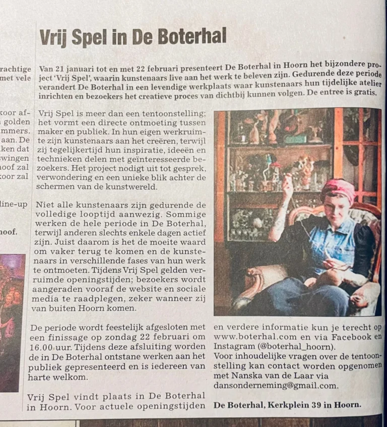 Van 21 januari tot en met 22 februari 2026 opent De Boterhal in Hoorn haar deuren voor een uniek initiatief: Vrij Spel. Gedurende deze periode transformeert De Boterhal tot een levendige werkplaats waar kunstenaars hun tijdelijke atelier inrichten en live aan het werk zijn. Bezoekers krijgen zo een bijzondere kans om het creatieve proces van dichtbij mee te maken.